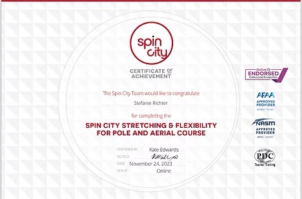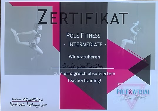 Seit 2014 bin ich mit Leidenschaft im Pole Sport aktiv und habe seither zahlreiche Ausbildungen absolviert - neben mehreren Pole-Trainer Ausbildungen bei Julia Wahl, Janine Hollung und XPert habe ich noch eine zertifizierte Ausbildung als Yoga-Trainerin für Erwachsene und Kinder sowie die XPert Children`s Pole & Aerial Professional Trainer, die Stretching Instructor Ausbildung bei Spin City und die XPert-Trainerausbildung für Aerial Hoop erfolgreich abgeschlossen.