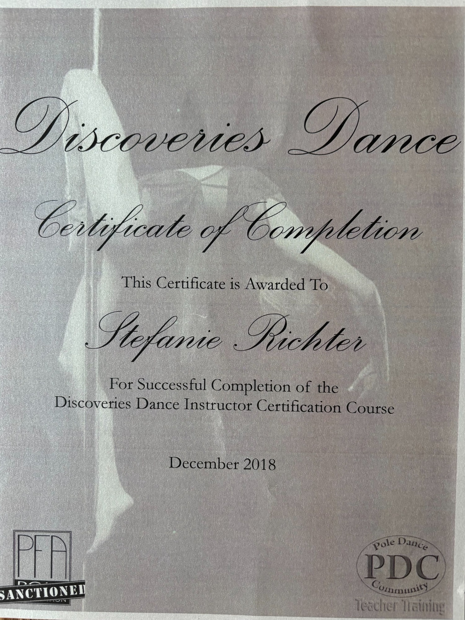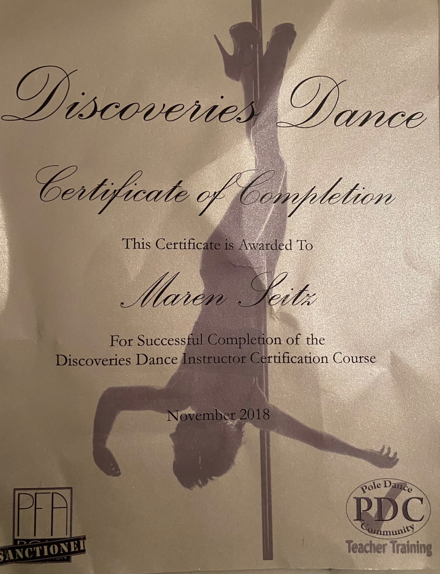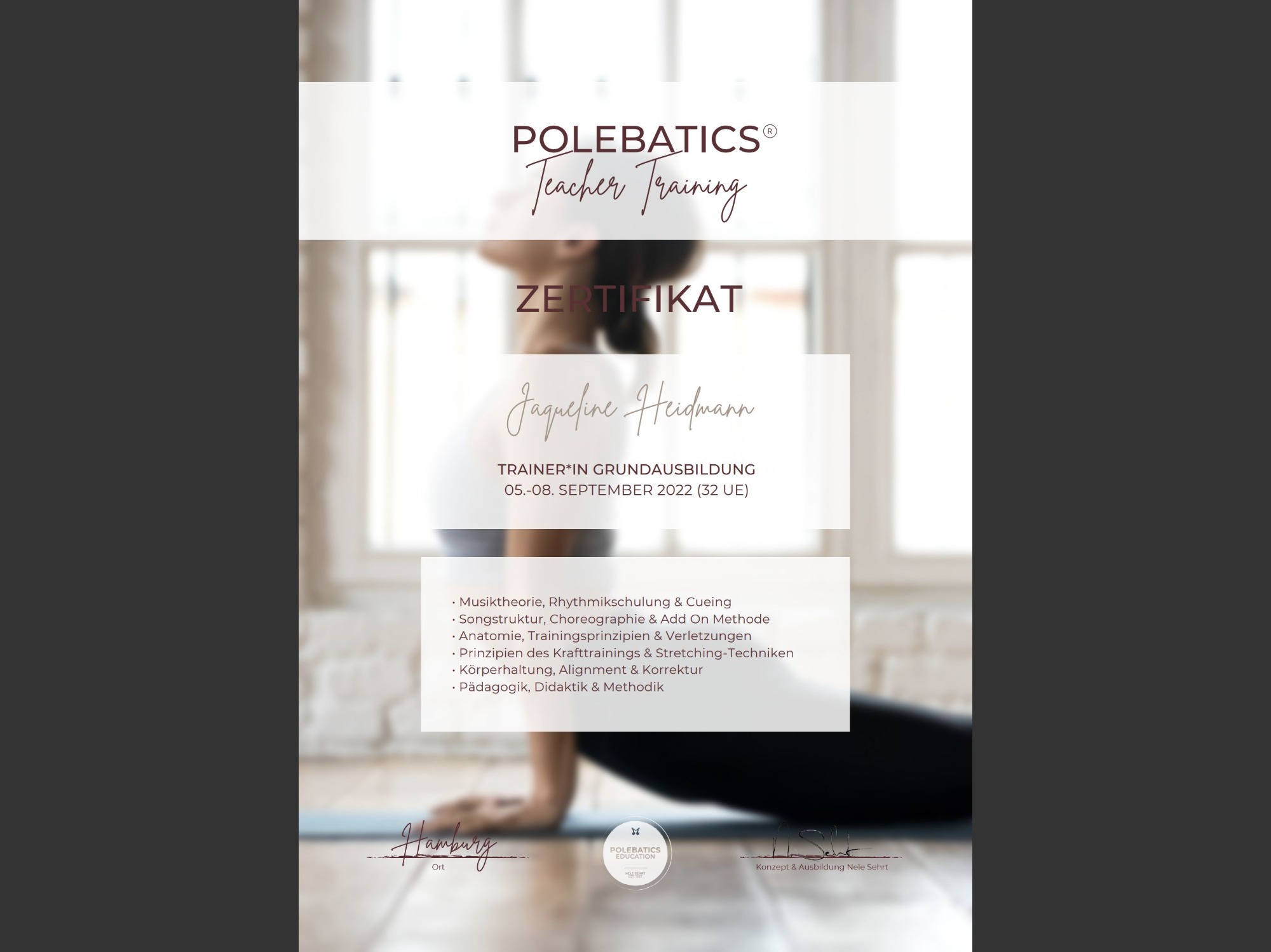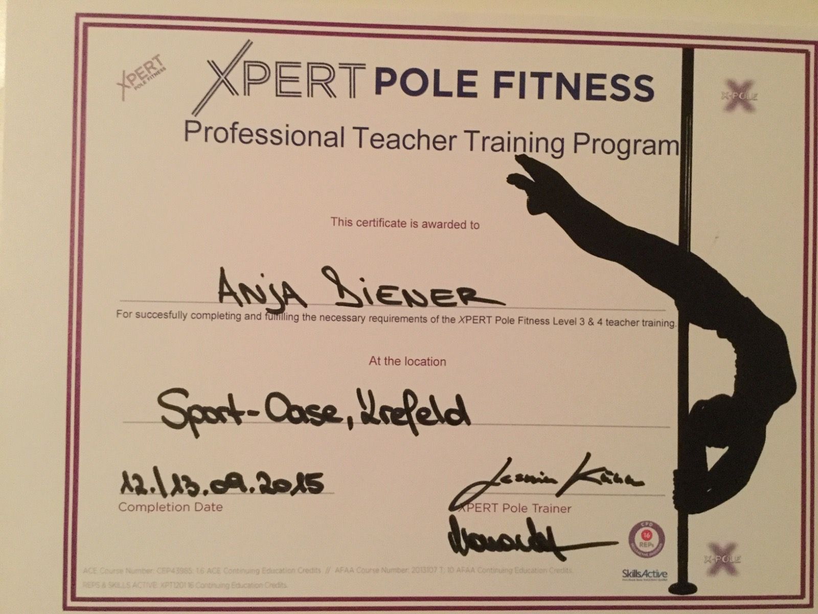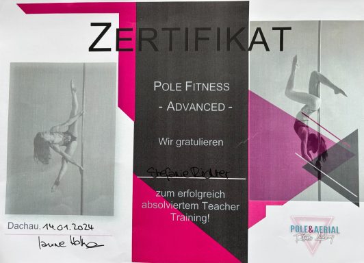 Ausgebildet wurde ich von meiner Trainerin Kristina Simonenko. Aktuell befinde ich mich in Ausbildung zur Ernährungsberaterin sowie Fitness Trainerin (B-Lizenz). Zudem habe ich die Pole Sport Judging Ausbildungen bei der PSO und IPSF absolviert.