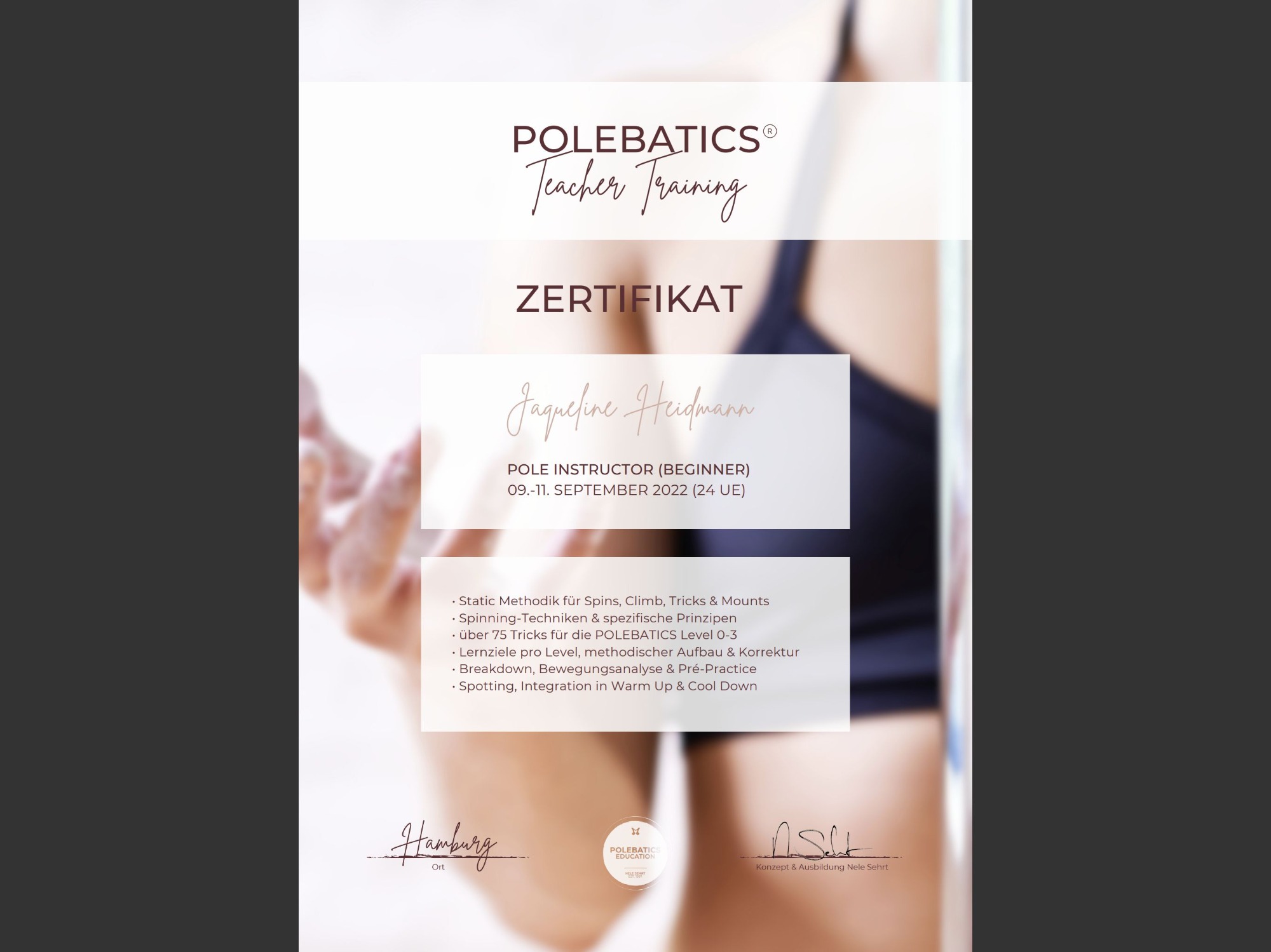 Sie hat im Jahr 2022 die Grundausbildung sowie Pole Beginner bei Pole Batics in Hamburg absolviert und bildet sich ebenfalls stets weiter.